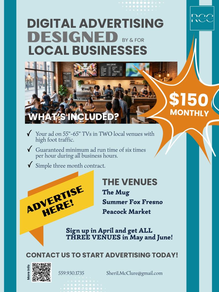 As a Fresno native, daughter of a female entrepreneur, and current small business owner, I want my consultancy to help our local businesses prepare for and maintain sustainable growth through healthy processes. The Community Marketing Partnership is one aspect of Root Cause Consulting that helps support our family businesses while also supporting other local businesses through both marketing and direct revenue. We would love you to consider joining us as either as a Marketing Partner (venue host) or a Community Partner (advertiser)!